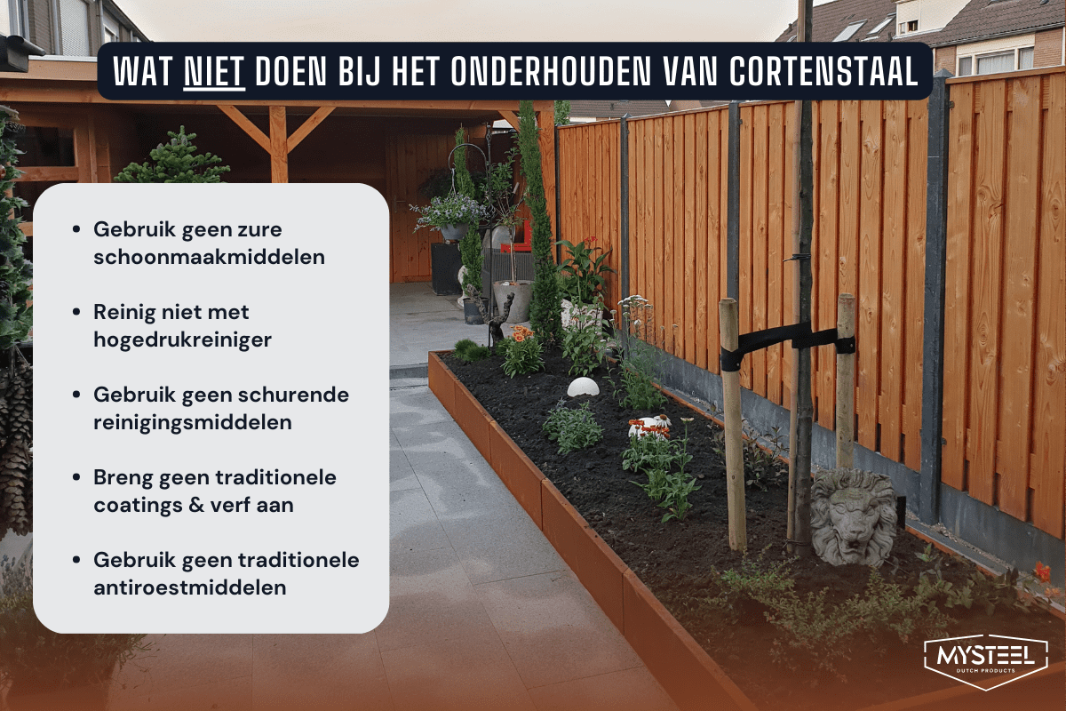 - Nie używaj myjek ciśnieniowych, chemikaliów ani kwaśnych środków czyszczących do czyszczenia stali cortenowej. Dzięki temu unikasz uszkodzeń.