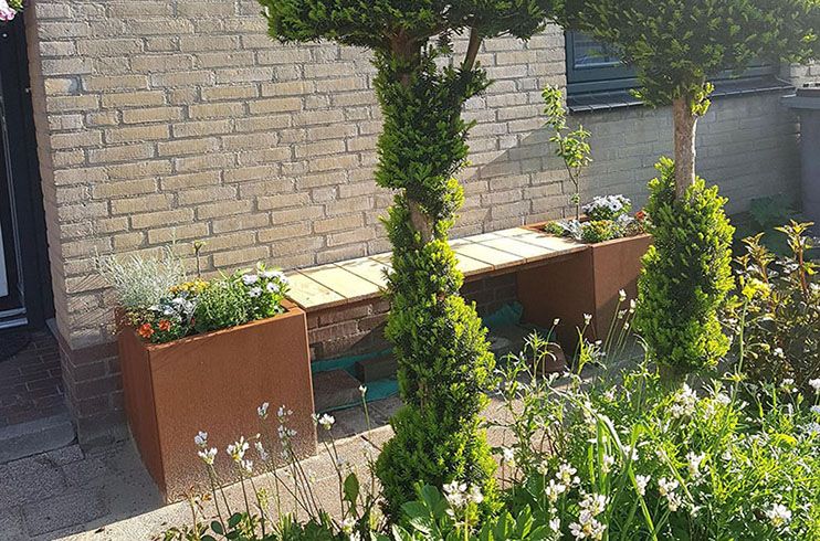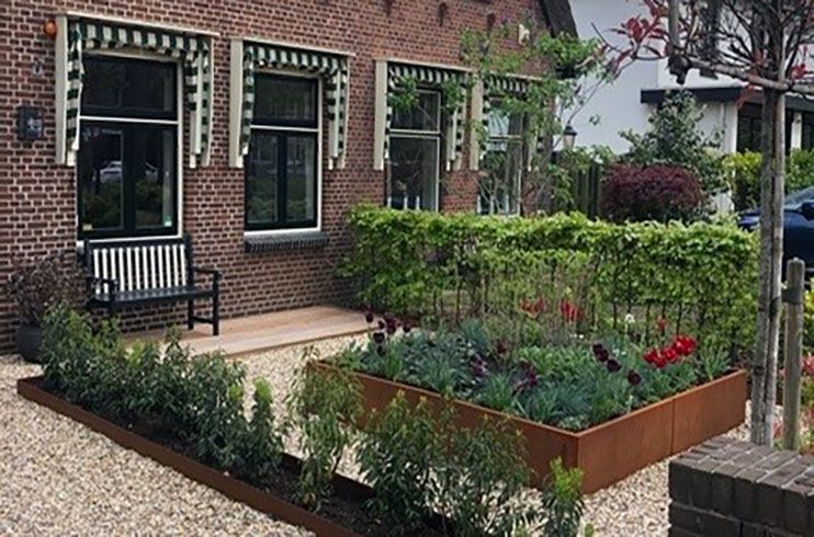 Z cortenstal możesz również stworzyć mocne wizualne oświadczenie w swoim ogrodzie frontowym. Jednym ze sposobów integracji cortenstalu w ogrodzie frontowym jest umieszczenie donicy z cortenstalu i nadanie zielonego akcentu swojemu ogrodowi. Możesz również dodać numer domu lub skrzyneczkę na listy z cortenstalu, aby stworzyć spójną całość. Lub połącz donice z ławką pomiędzy nimi, aby uzyskać przyjemny kącik wypoczynkowy przed domem. Jedną z zalet cortenstalu w ogrodzie frontowym jest to, że jest bezobsługowy; oznacza to, że możesz więcej cieszyć się swoim ogrodem, zamiast nad nim pracować.