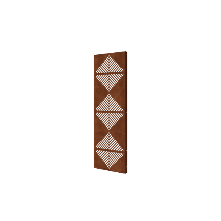 Ten panel jest wykonany z wysokiej jakości stali Corten-A, stopu metali składającego się z żelaza, miedzi, fosforu, krzemu, niklu i chromu. Unikalną cechą stali corten jest tworzenie się gęstej warstwy tlenku, która działa jako warstwa ochronnej rdzy. Ta warstwa zapobiega rdzewieniu i chroni wewnętrzny materiał przed dalszą oksydacją, podczas gdy proces korozji powoli postępuje.