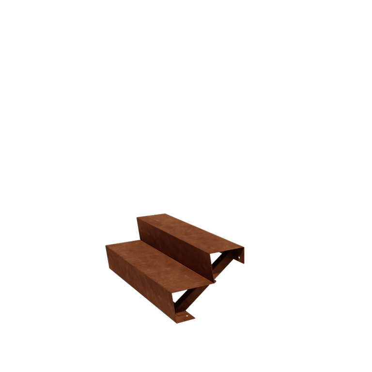 Materiał Te schody są wykonane z wysokiej jakości blachy stalowej Corten-A. Ten rodzaj metalu charakteryzuje się tym, że tworzy bardzo gęstą warstwę tlenku (warstwę rdzy). Przez to proces rdzewienia jest niemożliwy. Dzięki gęstej warstwie tlenku chronione jest głębiej położony materiał przed dostępem tlenu, co znacznie opóźnia utlenianie, podczas gdy korozja nadal postępuje. Schody z cortenstali są dostarczane bez rdzy, w szarym metalicznym kolorze. Proces rdzewienia rozpoczyna się w ciągu pierwszych 2 miesięcy, nie wymaga to żadnego specjalnego traktowania. W trakcie procesu rdzewienia schody mogą oddawać drobne cząsteczki. Cortenstahl to stop metali, który składa się z żelaza, do którego dodano miedź, fosfor, krzem, nikiel i chrom.